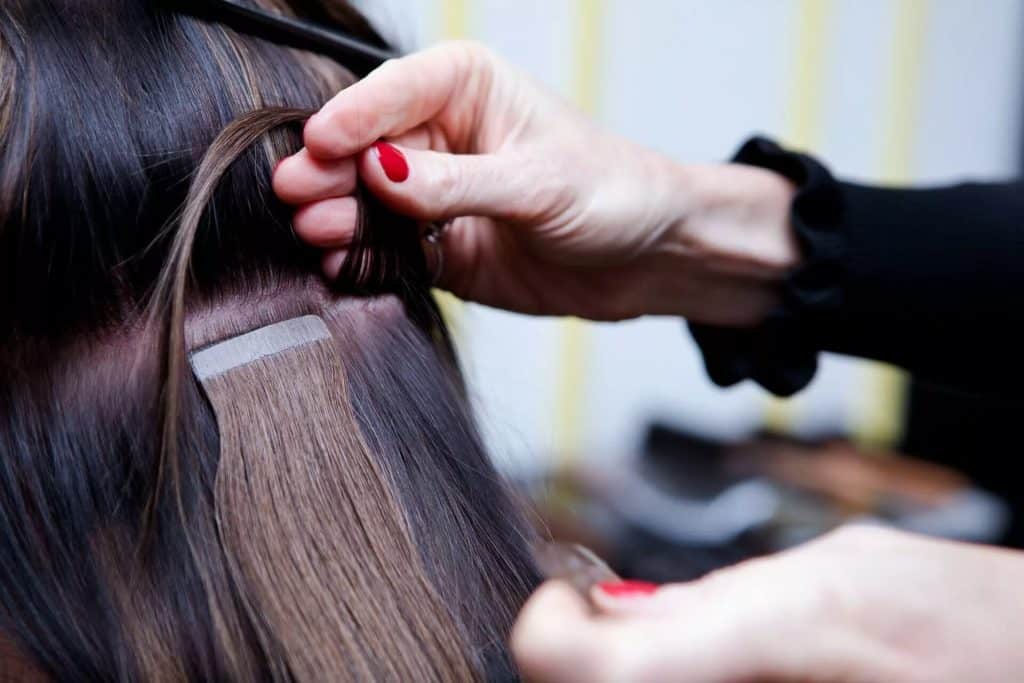Tape-in extensions come in wefts with a pre-taped adhesive strip at the top. A professional stylist applies them by sandwiching sections of your natural hair between two extensions. This process typically takes about 1-2 hours.